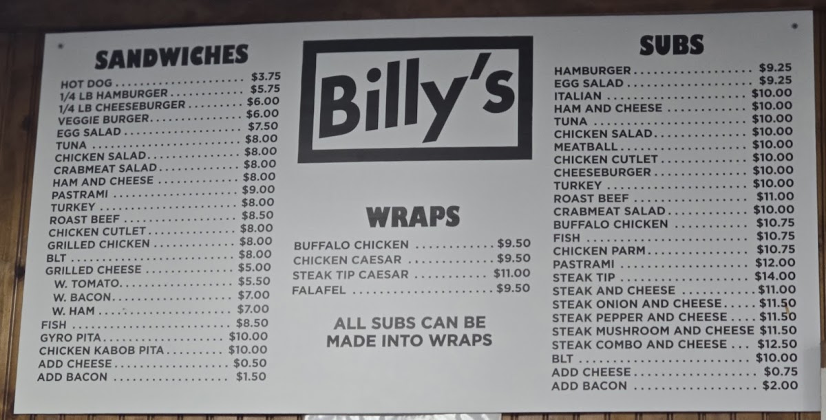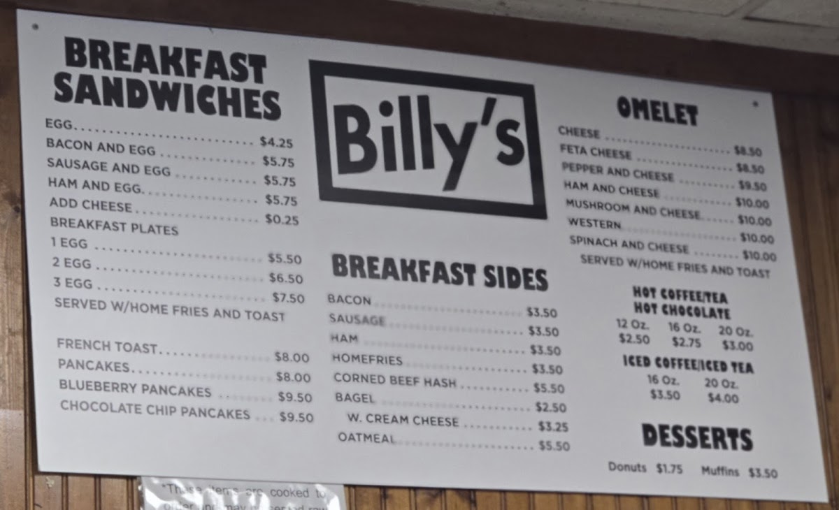 Billy’s Sub Shop offers a straightforward, satisfying menu centered around classic American diner fare and hearty sandwiches. The menu combines comforting breakfast options with a selection of expertly crafted subs, making it a dependable choice whether you're starting the day or looking for a casual lunch or dinner.